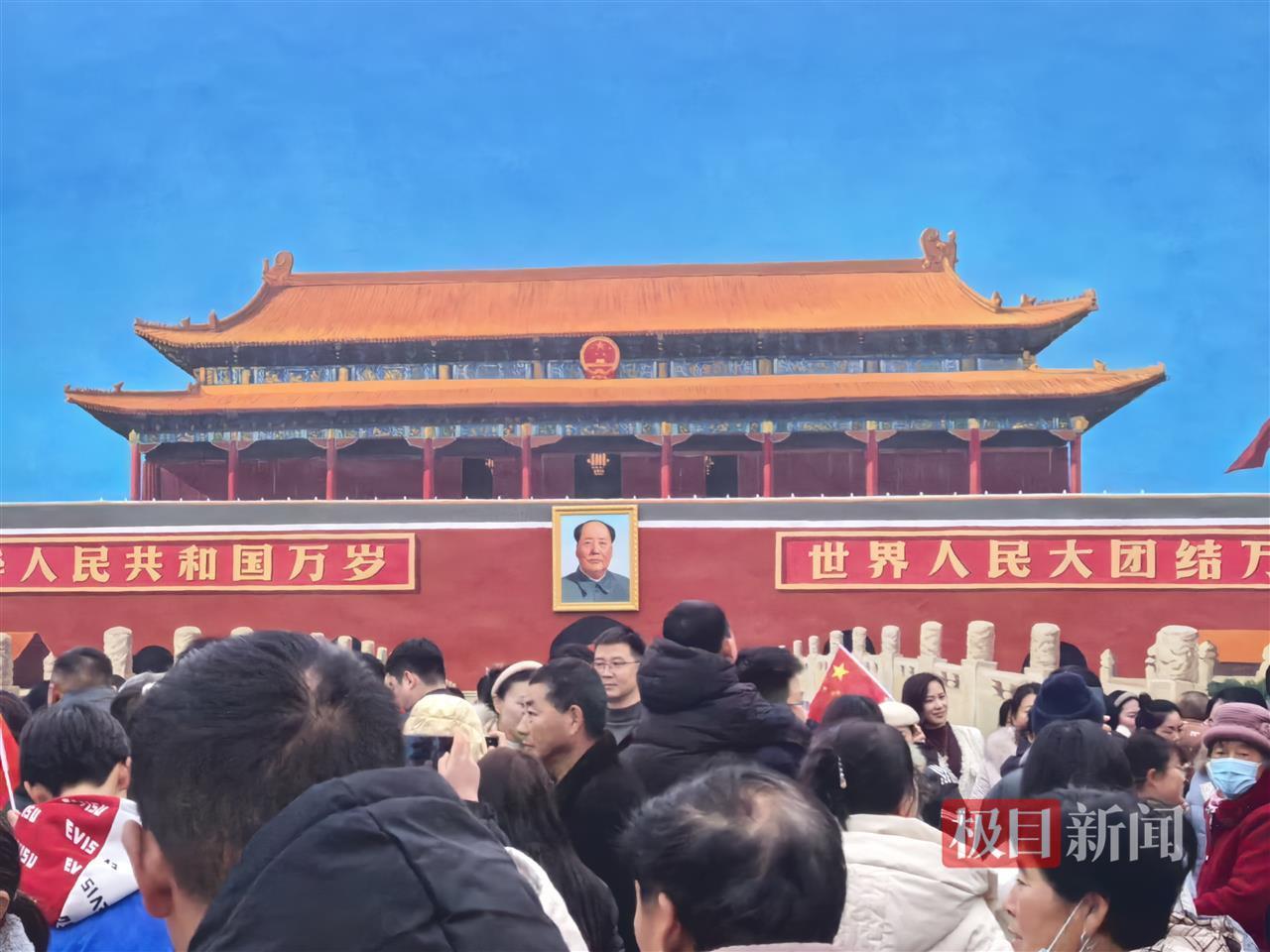 元旦假期,河南商丘吴营村,当地村民吴承言创作的巨幅“天安门”墙画迎来大量游客。村民热情好客,免费提供热水等服务。2日上午,村里小卖部的老板告诉极目新闻记者,吴营村火了之后,店里营业额翻了上十倍。